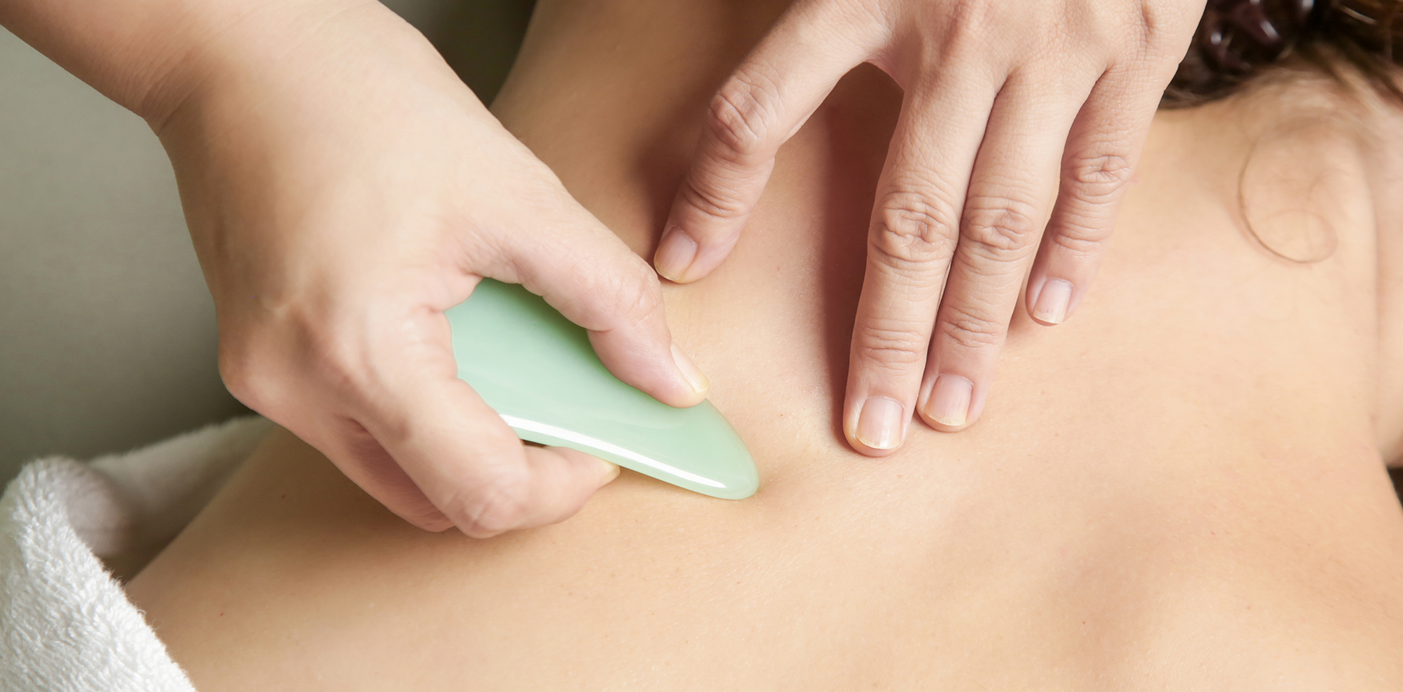 Gua Sha Massage a treatment in which the skin is scraped to produce light bruising with a smooth edge made of water buffalo horn. It is delivered, in an orderly fashion, on specific parts of the body, resulting in large area of bruising or petechial hemorrhages, to regulate body function and restore homeostasis.